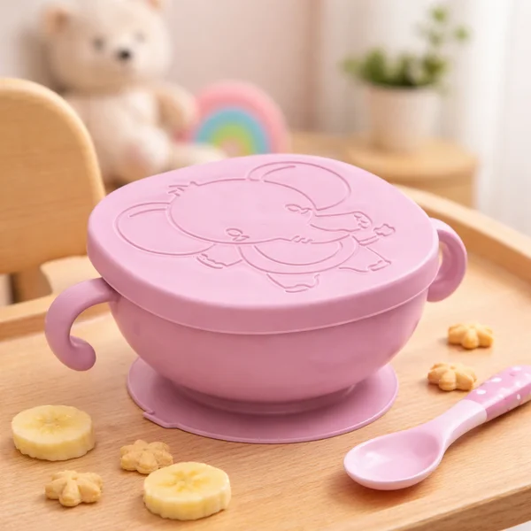 O Bowl de Plástico com Tampa e Ventosa Lyor - Elefante é ideal para bebês e crianças, garantindo uma alimentação mais organizada, sem bagunça e com muito mais segurança.