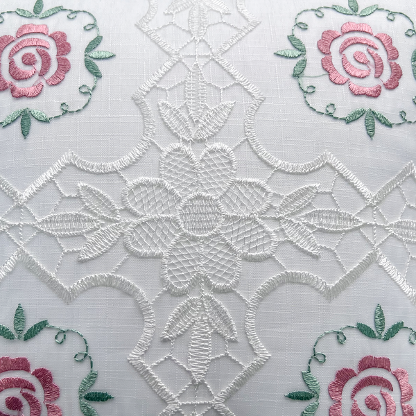 Design Floral Sofisticado: Renda branca com estampa de rosas e folhas verdes, criando um visual delicado e harmonioso.