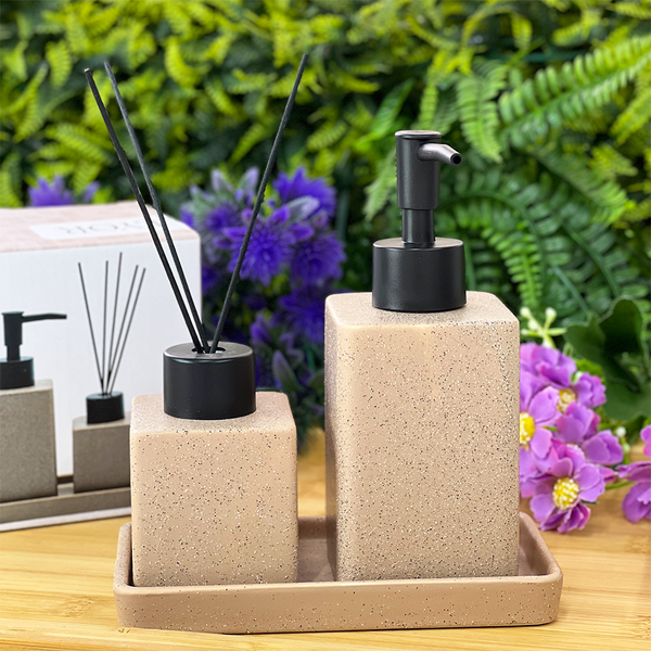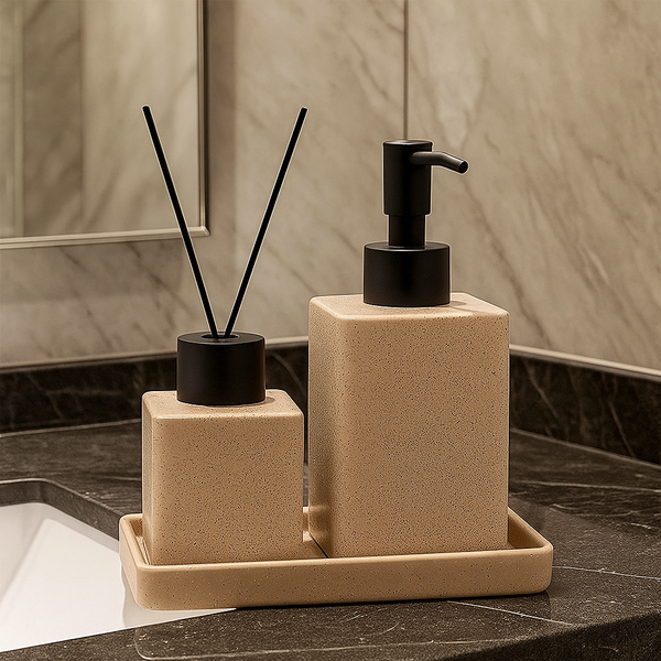 🛁✨ Dê um upgrade na decoração do seu banheiro com o Conjunto 3 Peças em Cerâmica Lyor – Granilite Nude Quadratto!