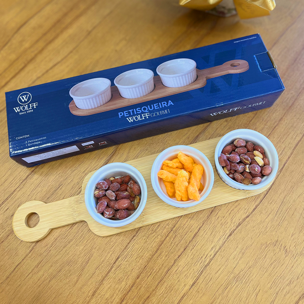 O Conjunto 3 Petisqueiras de Cerâmica Branca com Bandeja de Bambu - Wolff é a combinação perfeita entre charme, funcionalidade e durabilidade.