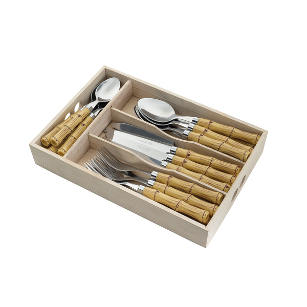 Transforme sua mesa com o Faqueiro Rojemac Aço Inox com Cabo Plástico Bambu - 24 Peças. Elegante e resistente, este faqueiro é perfeito para ocasiões especiais e o uso diário.
