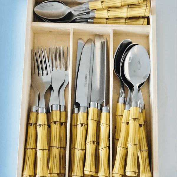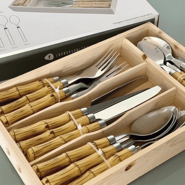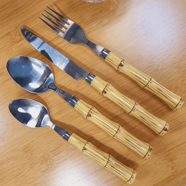 - Estilo Sofisticado: Cabos com design imitando bambu, trazendo um toque rústico e moderno à sua mesa.