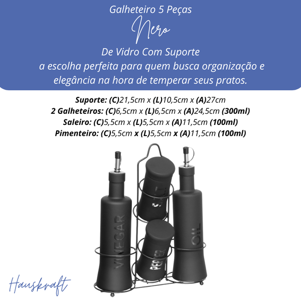 O Galheteiro 5 Peças de Vidro com Suporte Hauskraft - Nero é a escolha perfeita para quem busca organização e elegância na hora de temperar seus pratos.