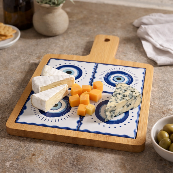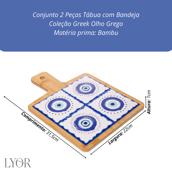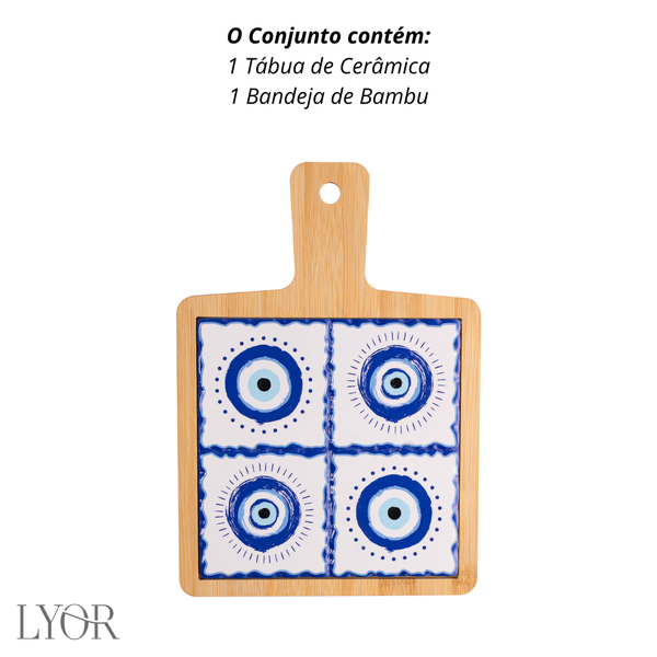 Leve mais significado e sofisticação à sua mesa com o Jogo para Servir Lyor com Tábua de Bambu e Cerâmica Olho Grego.