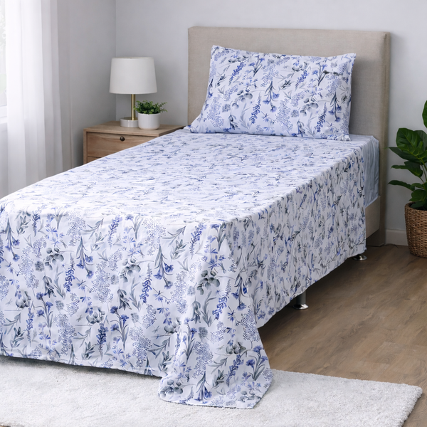 1 Lençol Solteiro (1,60m x 2,20m): Estampa floral em azul claro sobre fundo branco, trazendo elegância e tranquilidade ao seu quarto.