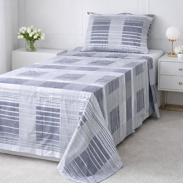 1 Lençol Solteiro (1,60m x 2,20m): Apresenta listras em vários tamanhos e tons de cinza, proporcionando um visual moderno e sofisticado.