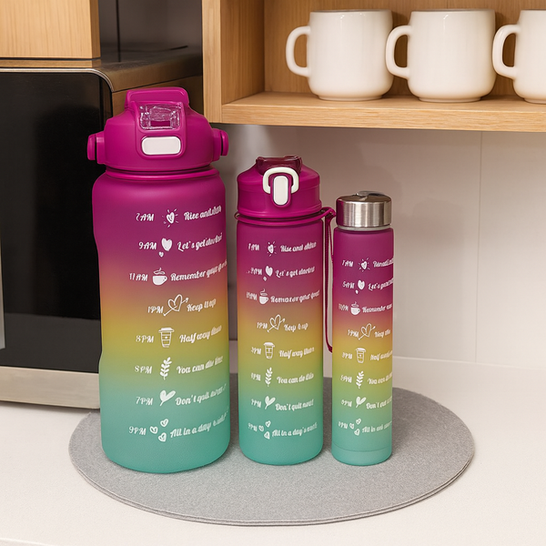 O Kit 3 Garrafas de Água Squeeze em Degradê é perfeito para quem busca hidratação eficiente, design moderno e alta durabilidade em qualquer momento do dia.