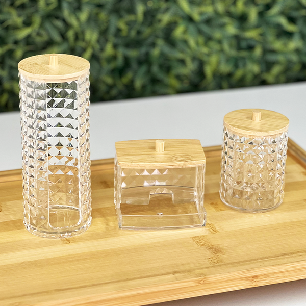 ✨ Design sofisticado: Transparência com textura elegante e tampa em bambu natural.