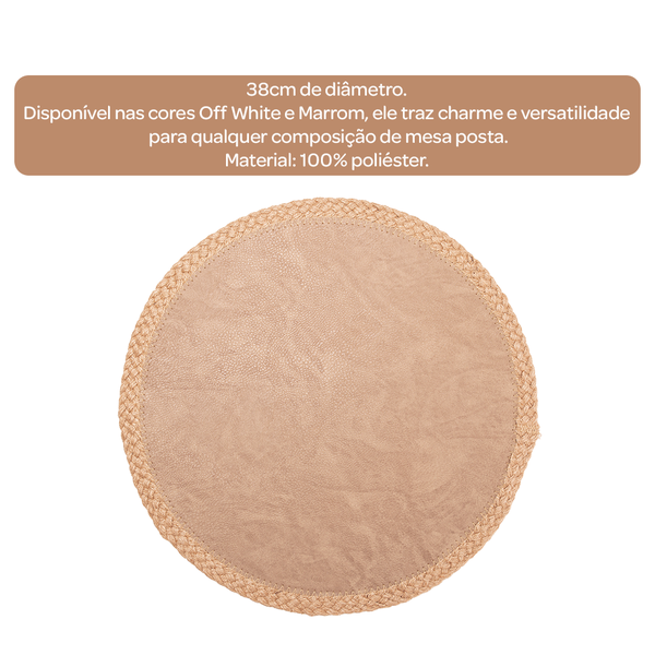 ✔ Design Sofisticado – Combinação de tons neutros para uma decoração elegante. ✔ Acabamento em Juta – Borda refinada que adiciona um toque rústico e sofisticado. ✔ Tamanho Ideal – Diâmetro de 38cm, perfeito para acomodar pratos e talheres com conforto. ✔ Versatilidade de Uso – Ideal para jantares especiais, almoços em família e até mesmo uso diário. ✔ Fácil de Limpar – Basta passar um pano úmido para manter a peça impecável.