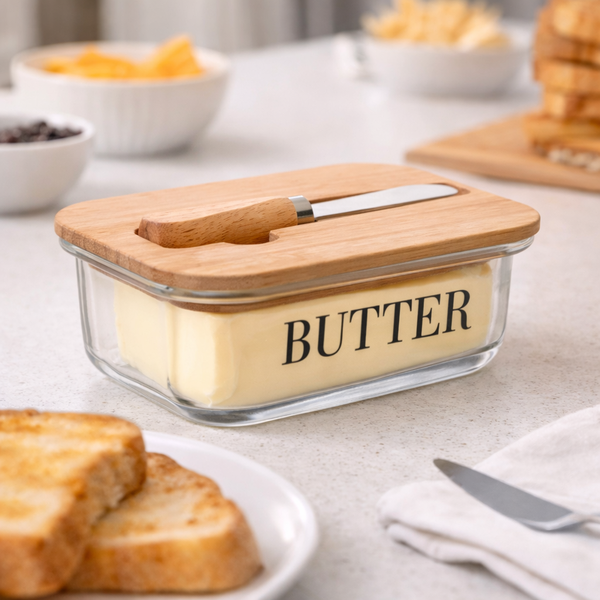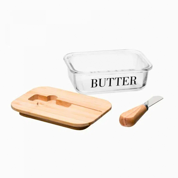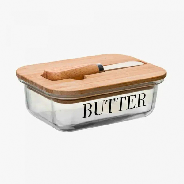 A Manteigueira de Vidro Wolff com Espátula e Tampa de Bambu é o acessório perfeito para armazenar e servir manteiga com elegância.