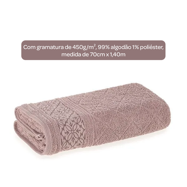 Medindo 70cm x 1,40m, essa toalha é confeccionada com 99% algodão em fio penteado e 1% poliéster, oferecendo toque delicado, resistência e sofisticação.