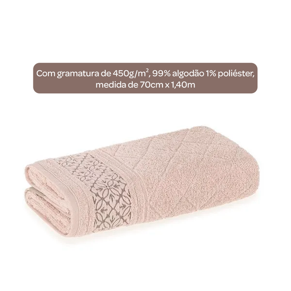 Medindo 70cm x 1,40m, essa toalha é confeccionada com 99% algodão em fio penteado e 1% poliéster, oferecendo toque delicado, resistência e sofisticação.